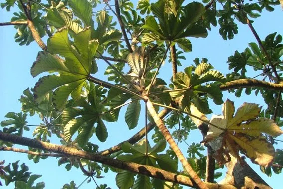 Cecropia trees have a hollow trunk and branches, which are divided into a series of chambers by partitions. The tree produces special structures in velvety-brown glandular patches under the leaf stems, providing nourishment for Azteca ants, which defend the leaves.